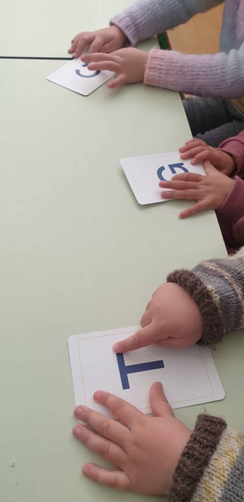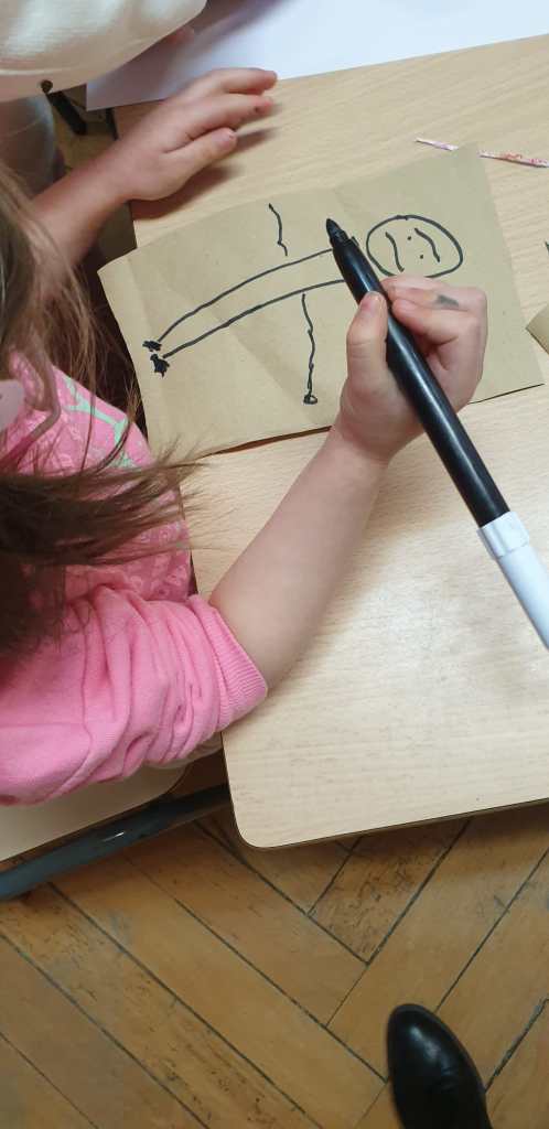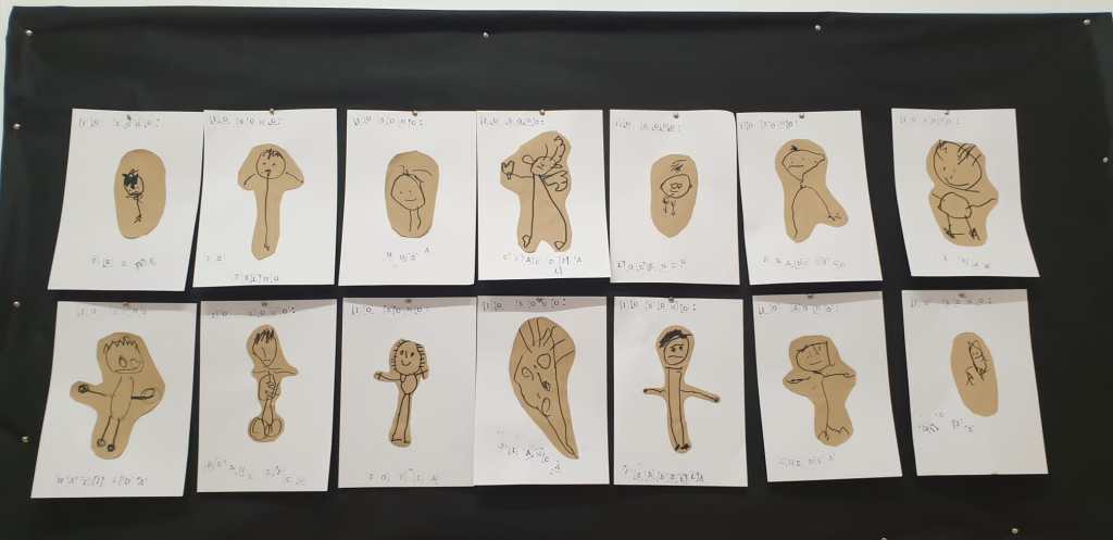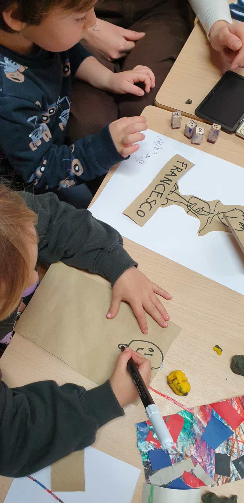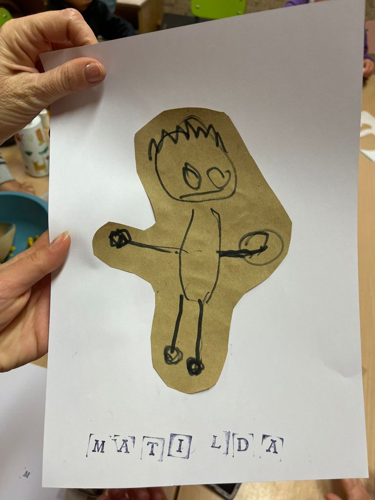 Passiamo dall’iniziale del nostro nome a comporlo intero utilizzando i timbri, abbinando un simpatico gioco di riconoscimento e riflessione sulle parti e forme del corpo per delineare il nostro ritratto.