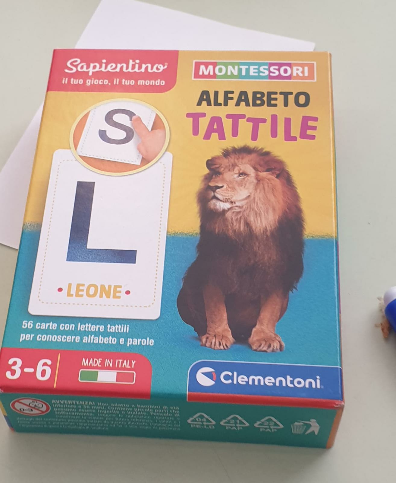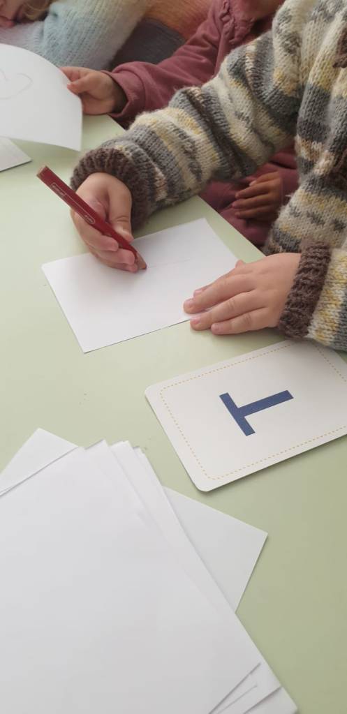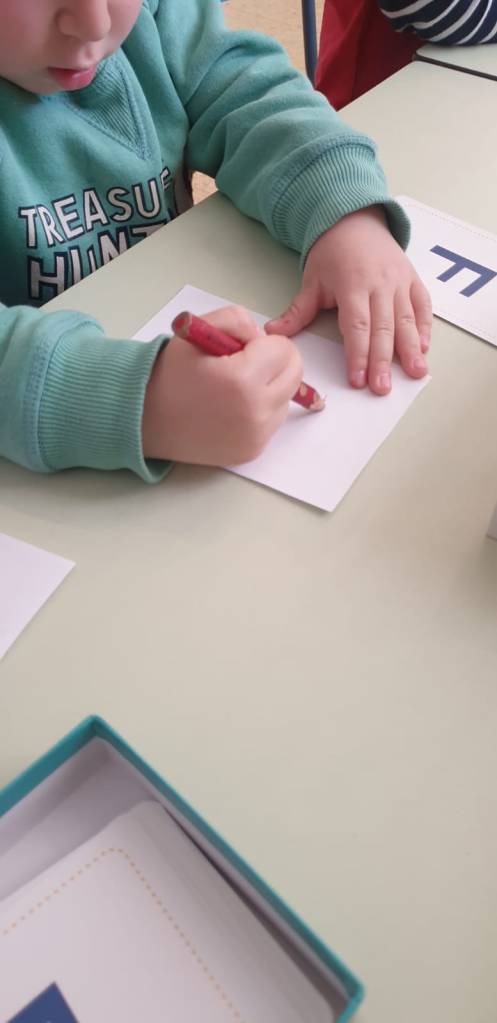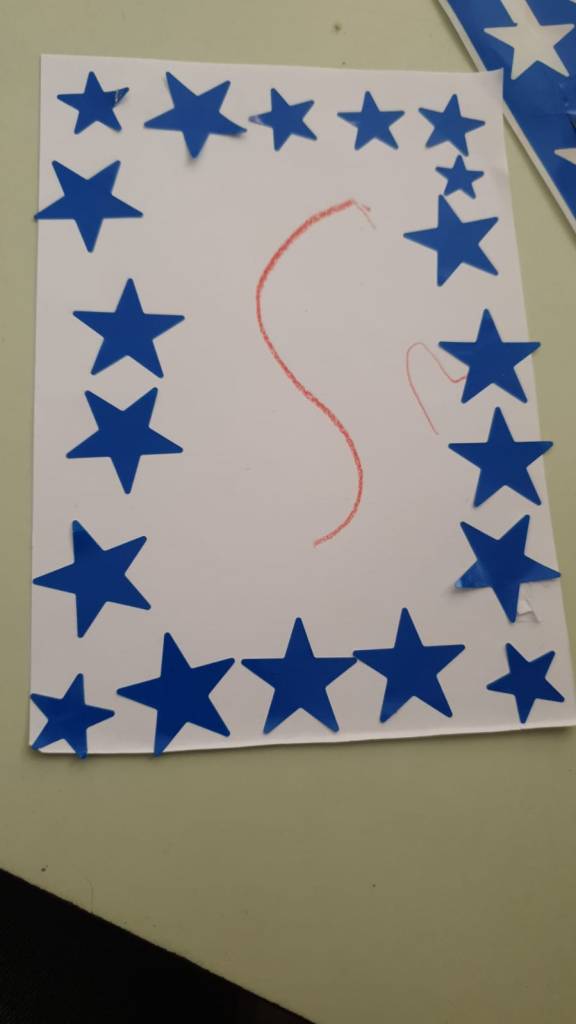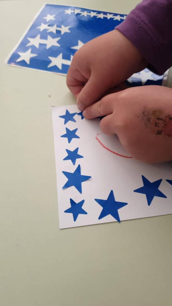 Usando l’alfabeto tattile montessoriano con le letterine dell’alfabeto in rilievo, seguiamo il loro contorno. Poi proviamo a riprodurre sul foglio le iniziali del nostro nome. E per finire le decoriamo con le stelline adesive.