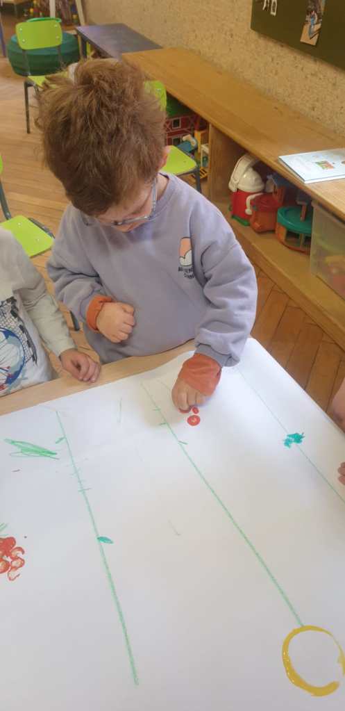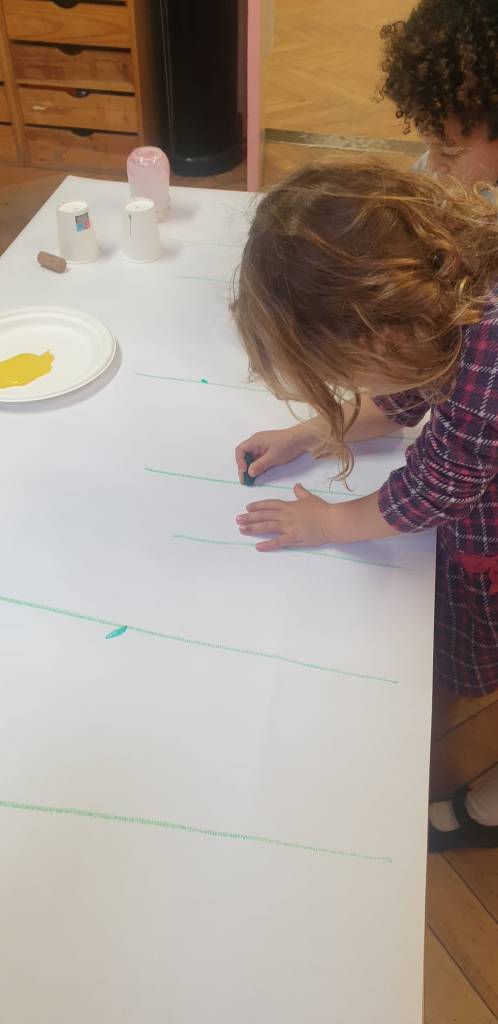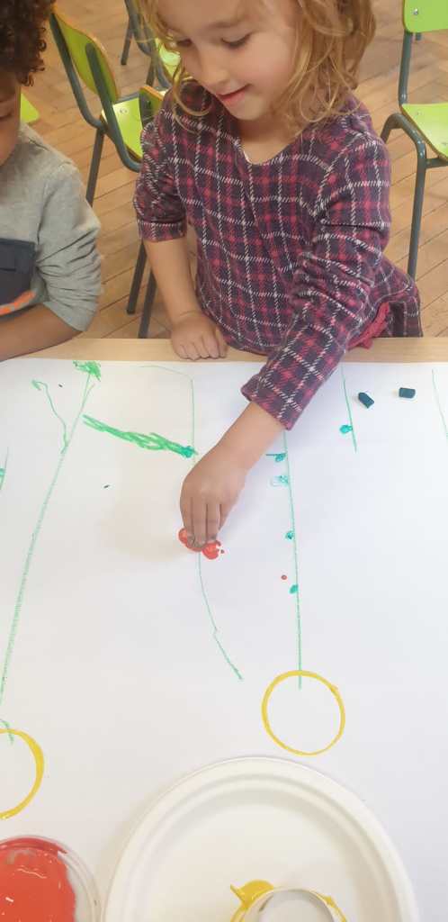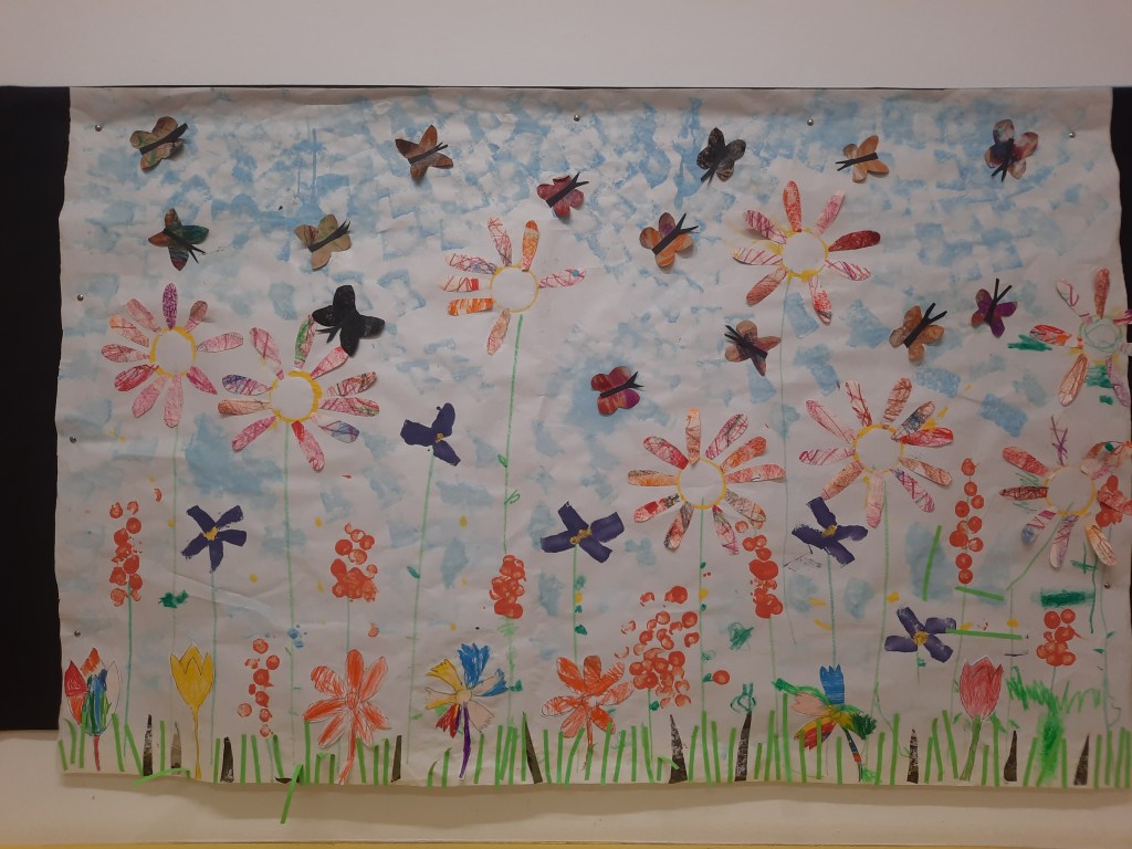 Papier collè di primavera con stampi a tempera e ritagli di carta, realizzato con il sottofondo musicale della Primavera di A. Vivaldi.