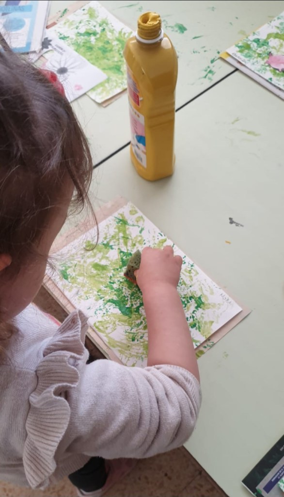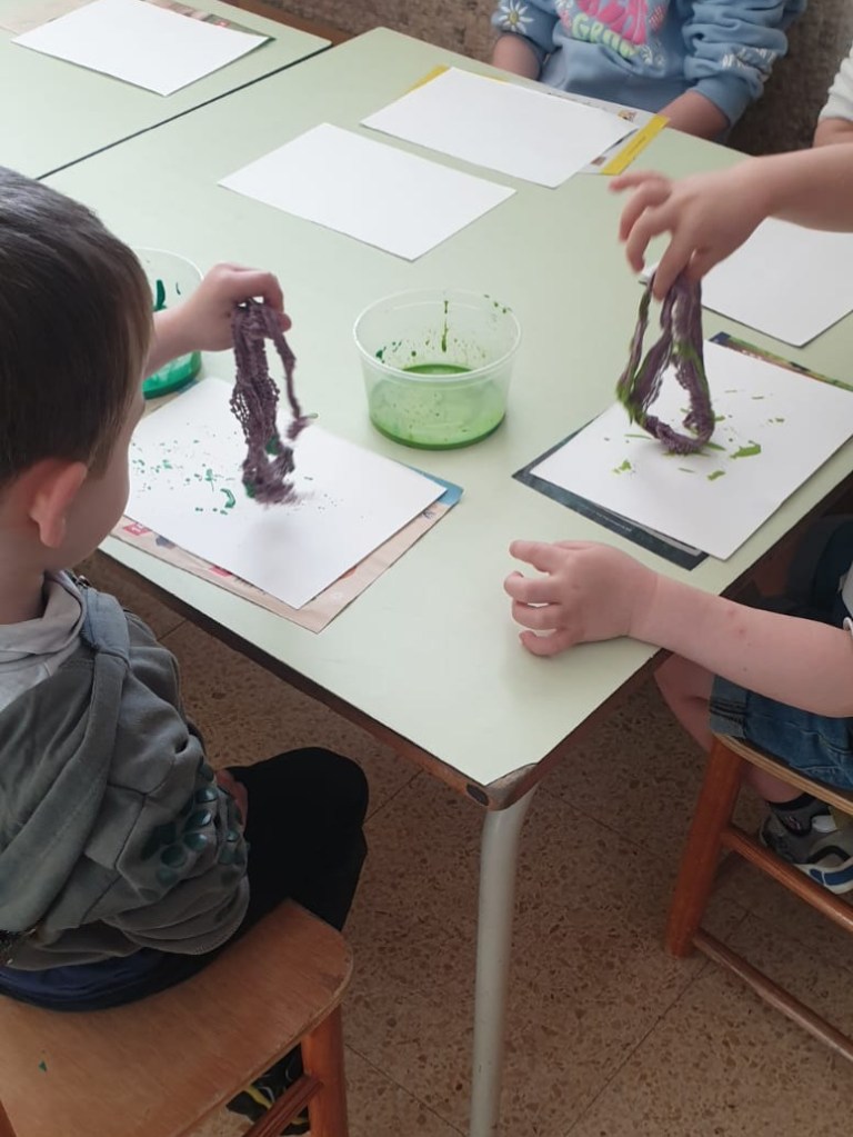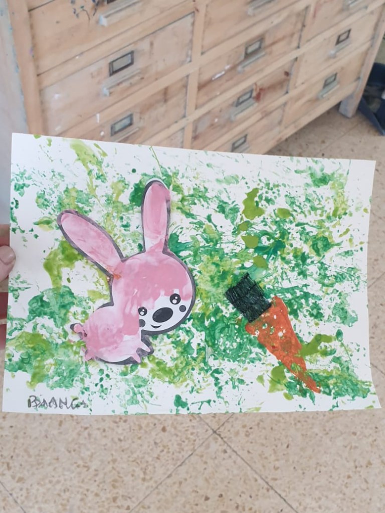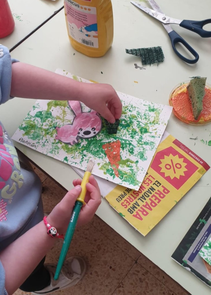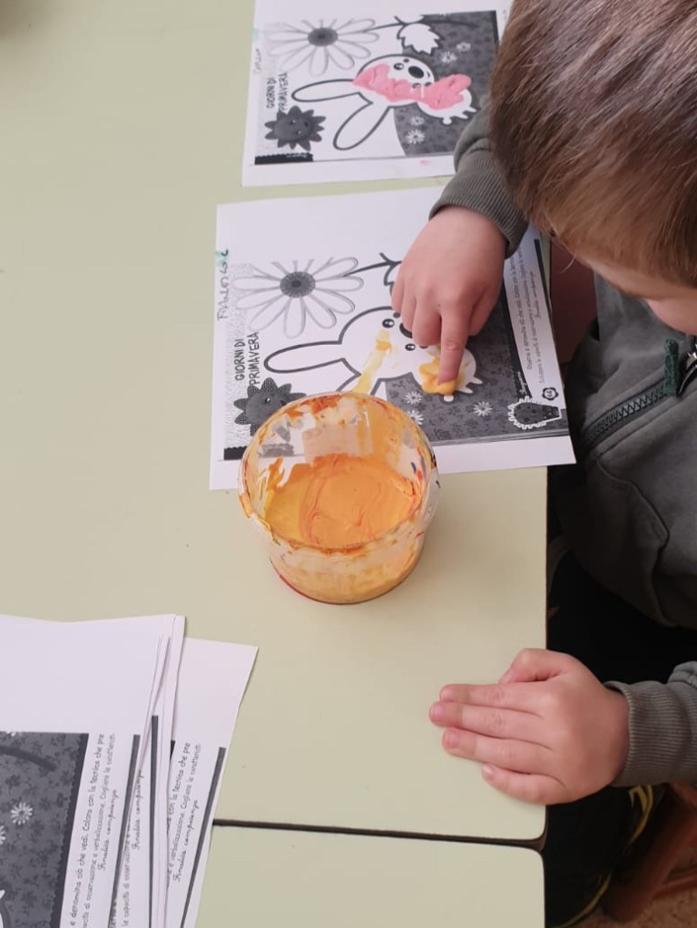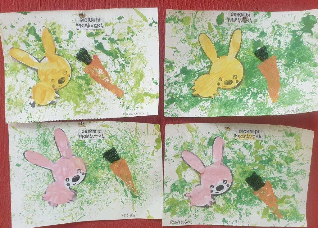 Dopo la lettura del racconto “Buon appetito Signor Coniglio!” di Claude Boujon realizziamo le nostre opere d’arte usando le tecniche di pittura con lacci e pizzi, pittura a dita e collage.