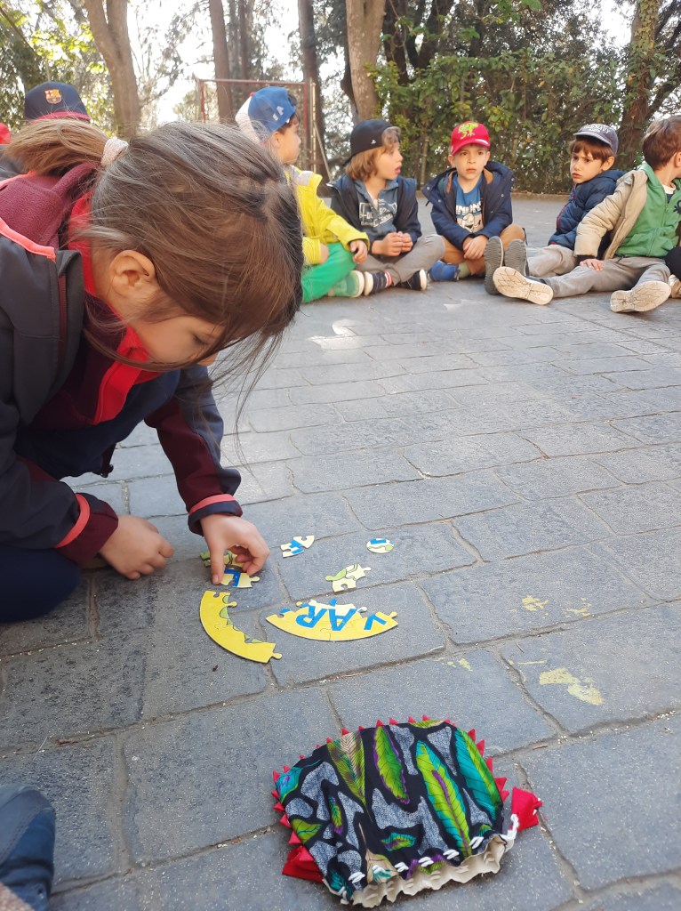 Ma prima di tutto, dopo la colazione, ci siamo riuniti per aprire il sacchetto che abbiamo trovato ieri durante l’esplorazione notturna! Dentro abbiamo trovato dei pezzi di puzzle, ma abbiamo scoperto che ne mancano altri per poterlo completare e, quindi, decifrare. Dove saranno? Forse ieri i 3 e 4 anni li hanno trovati durante la loro esplorazione a Sarrià? Dovremmo aspettare di tornare a scuola per risolvere il mistero.