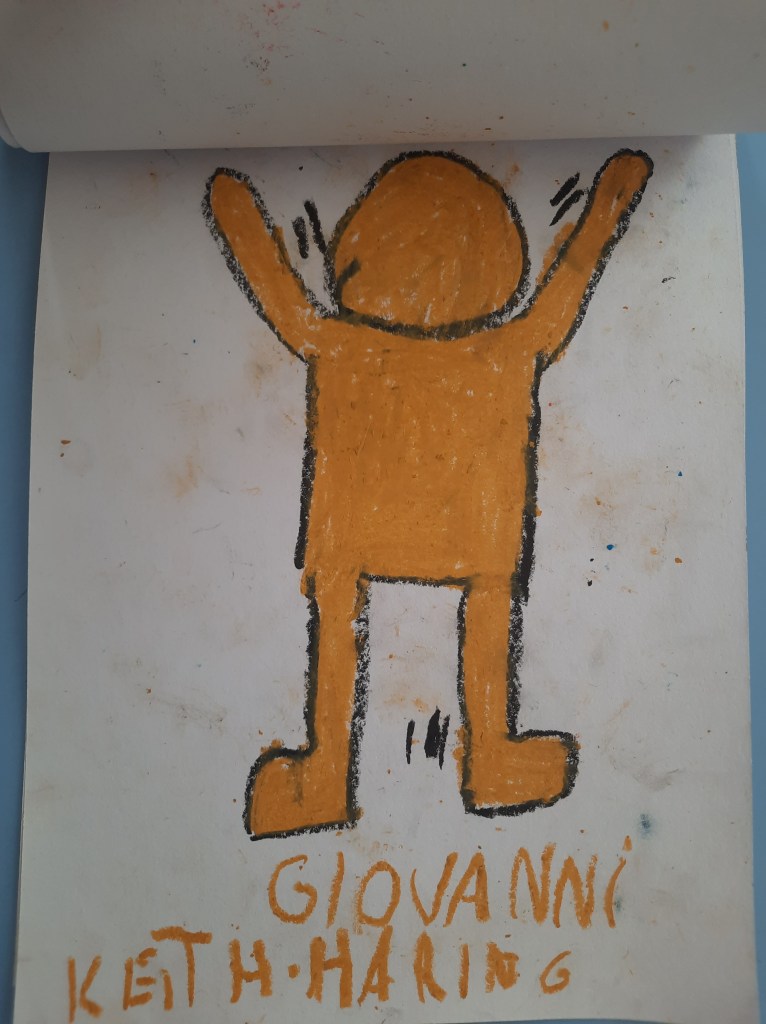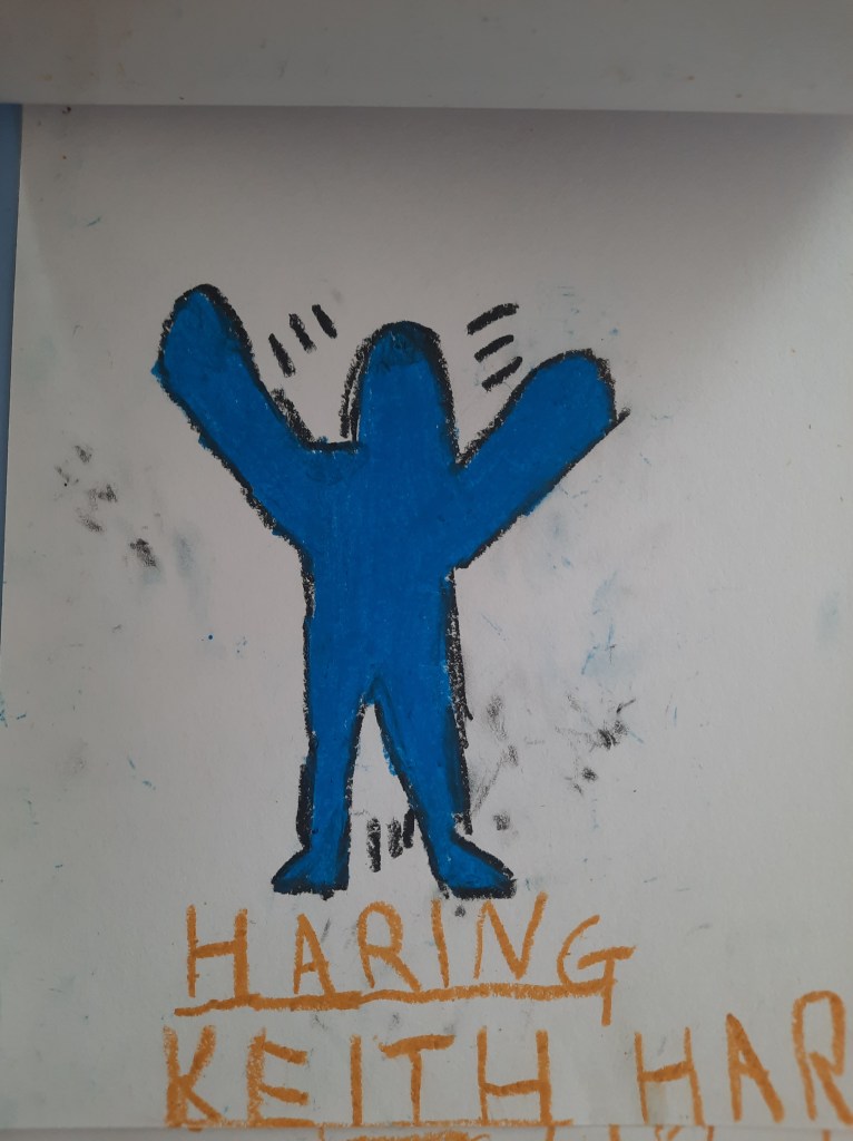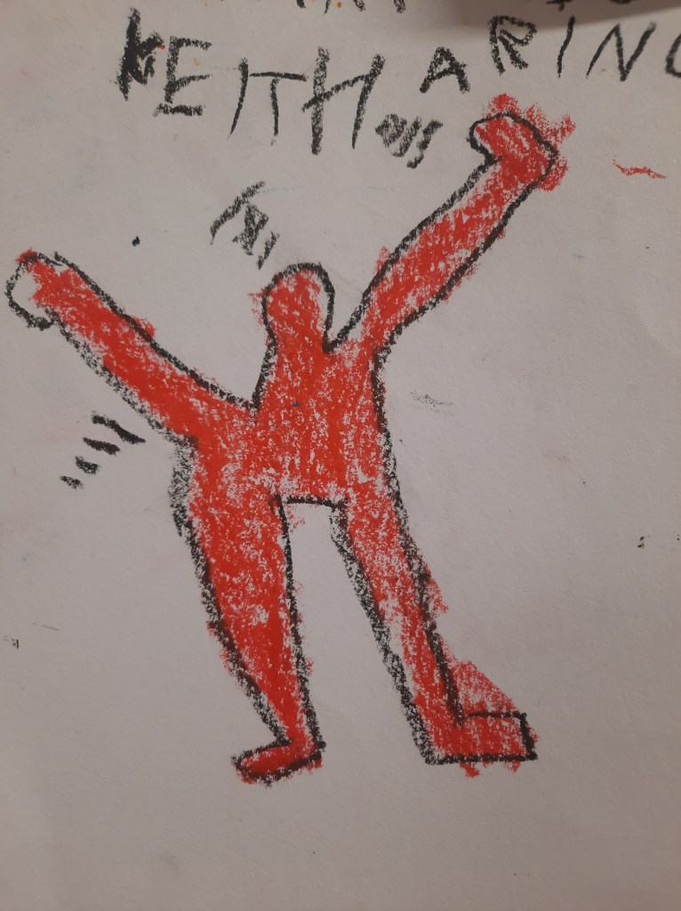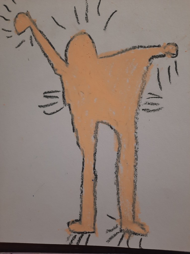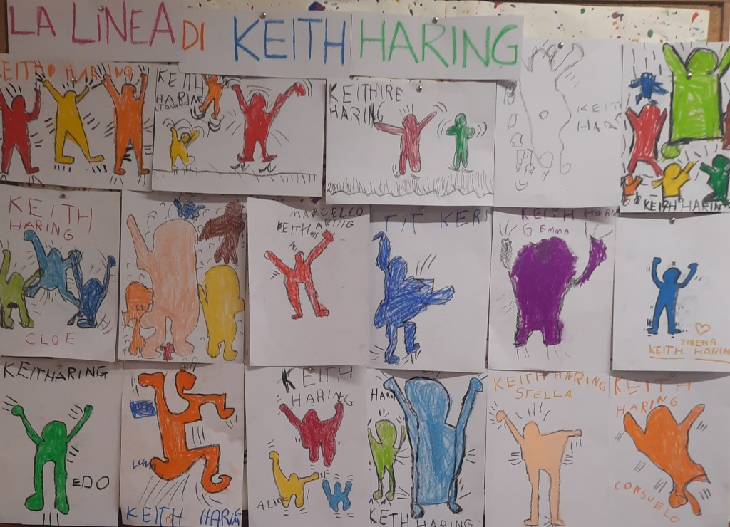 Anche quella di Keith Haring è una linea che non si spezza e che passa contagiosamente da omino a omino, una linea chiara, grossa e continua che diviene contorno, contenuto, decorazione e che fa emergere con forza il ritmo e il dinamismo del movimento.