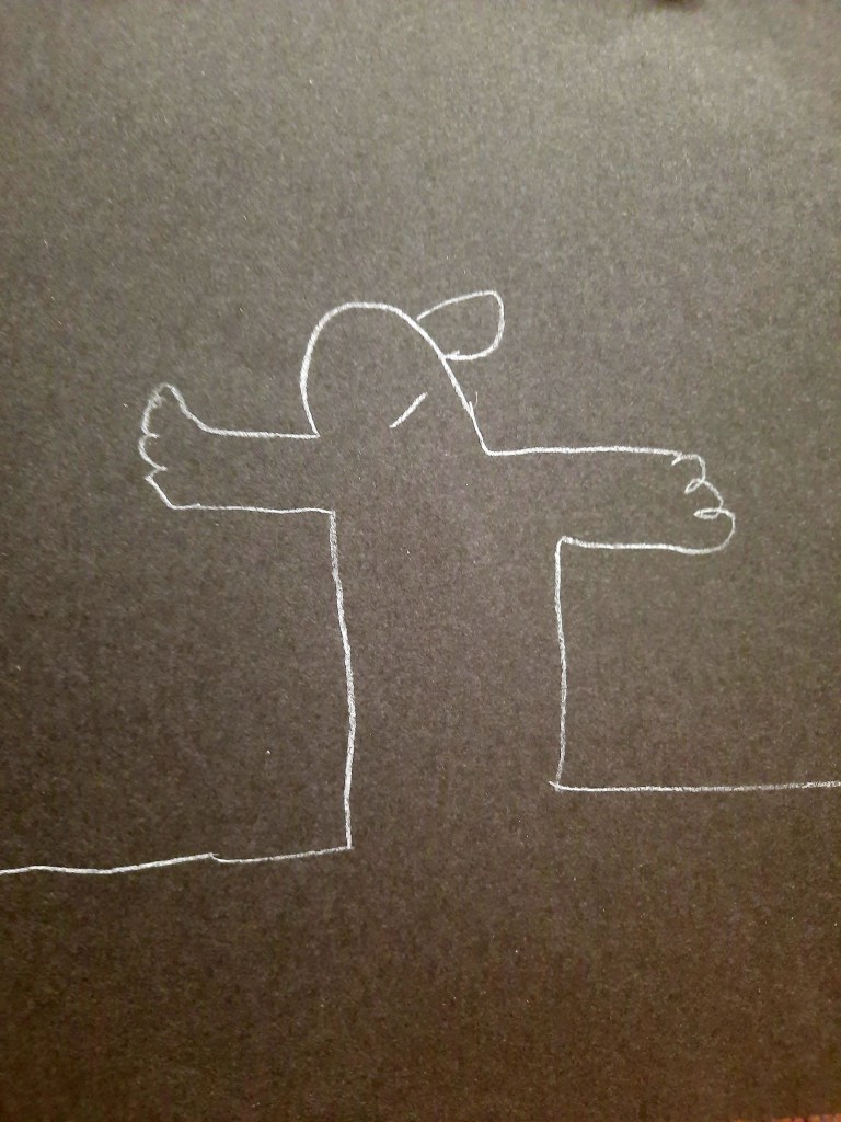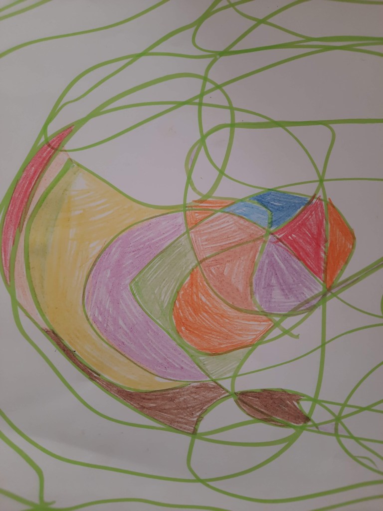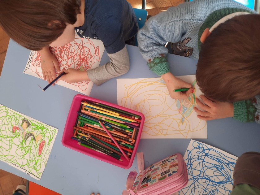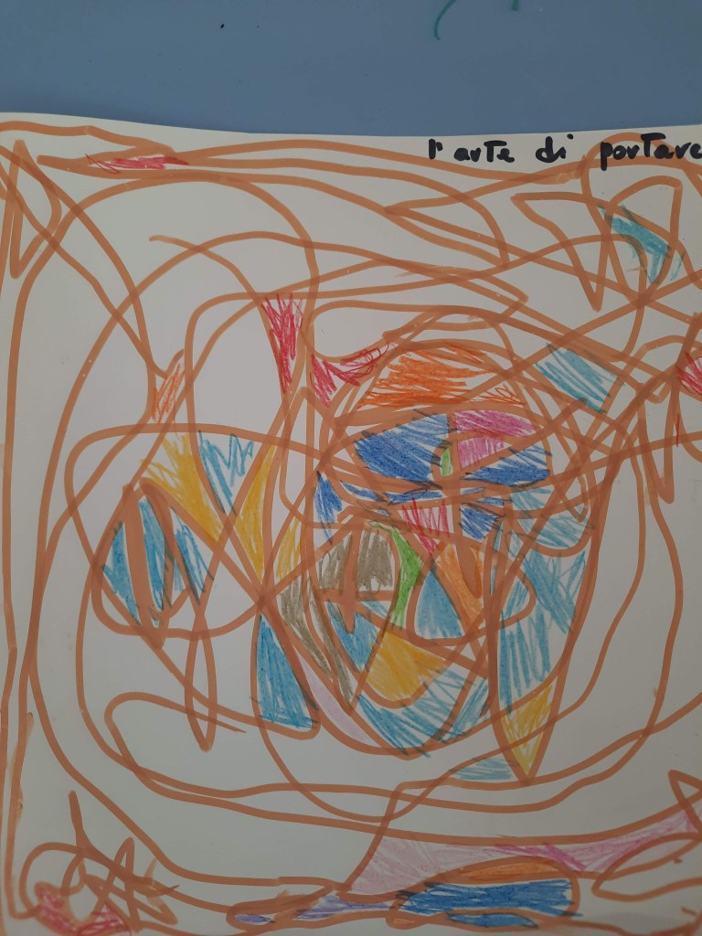 Anche noi proviamo semplicemente a portare a spasso una linea, senza pensare, senza staccare mai il pennarello dal foglio, facendola ondeggiare al ritmo della musica e sorprendendoci poi dell’effetto ottenuto, dei pieni e dei vuoti, delle forme create.