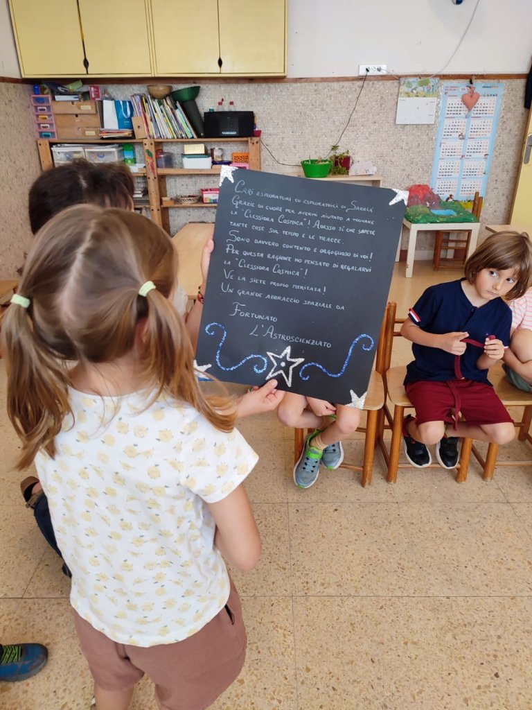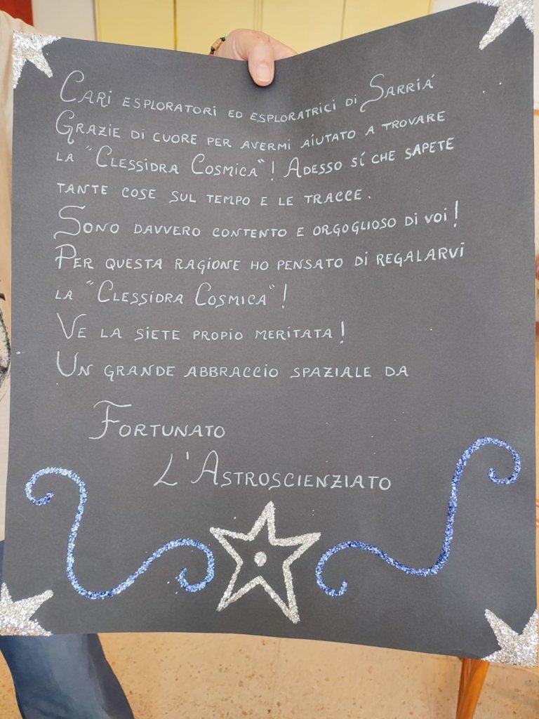 La settimana scorsa é giunto a scuola un bel messaggio di Fortunato l’astroscienziato. Nel messaggio, Fortunato ha ringraziato moltissimo gli esploratori e le esploratrici di Sarriá, per aver ritrovato la “Clessidra Cosmica “. É stata tanta la sua gioia, che ci ha detto di essere orgogliosissimo di noi e ha pensato di regalarci la Clessidra. Cosi terremo a scuola questo bellissimo ricordo della nostra fantastica avventura con Fortunato!!!! Evviva gli esploratori e le esploratrici di Sarriá!!!!