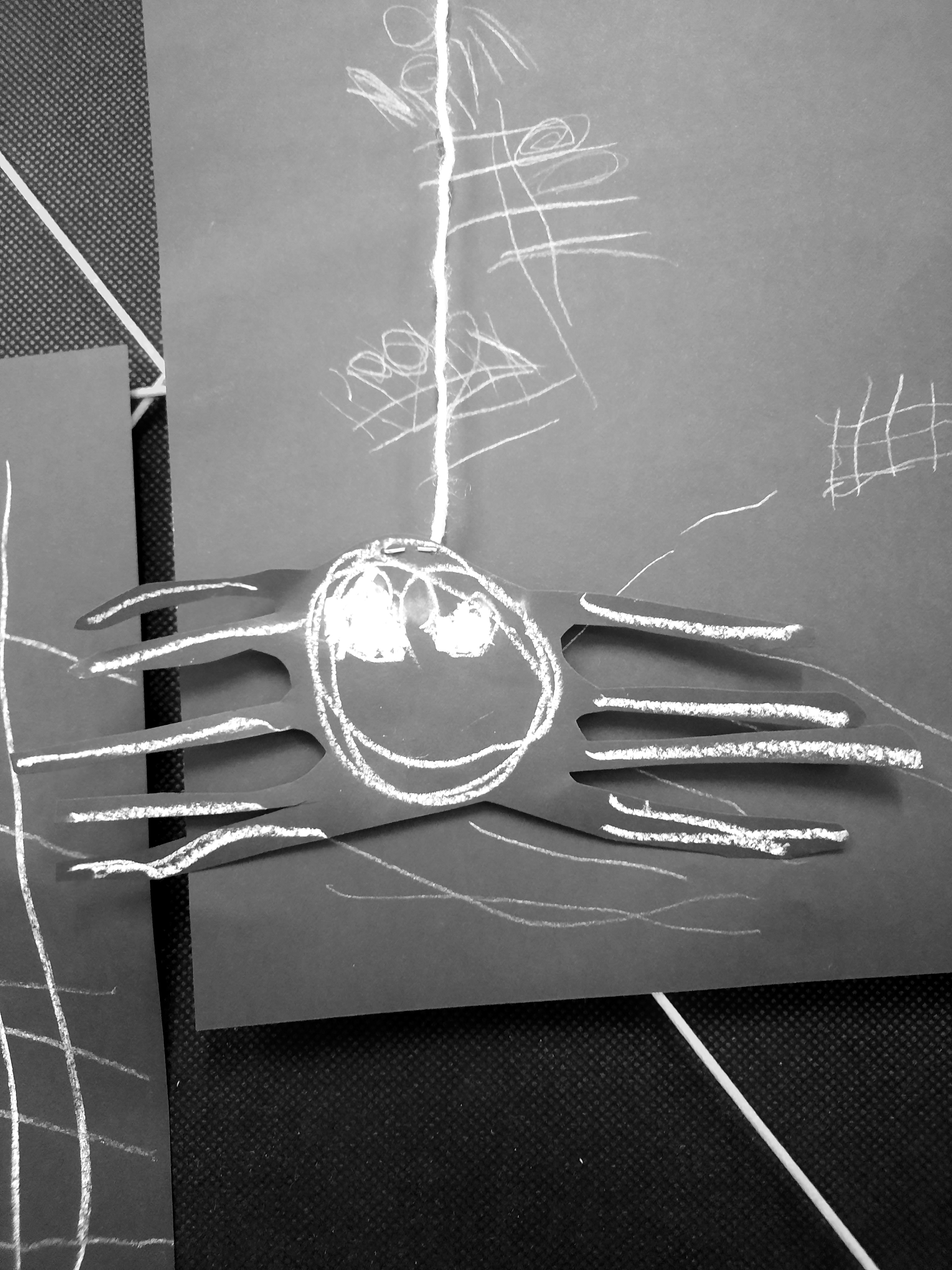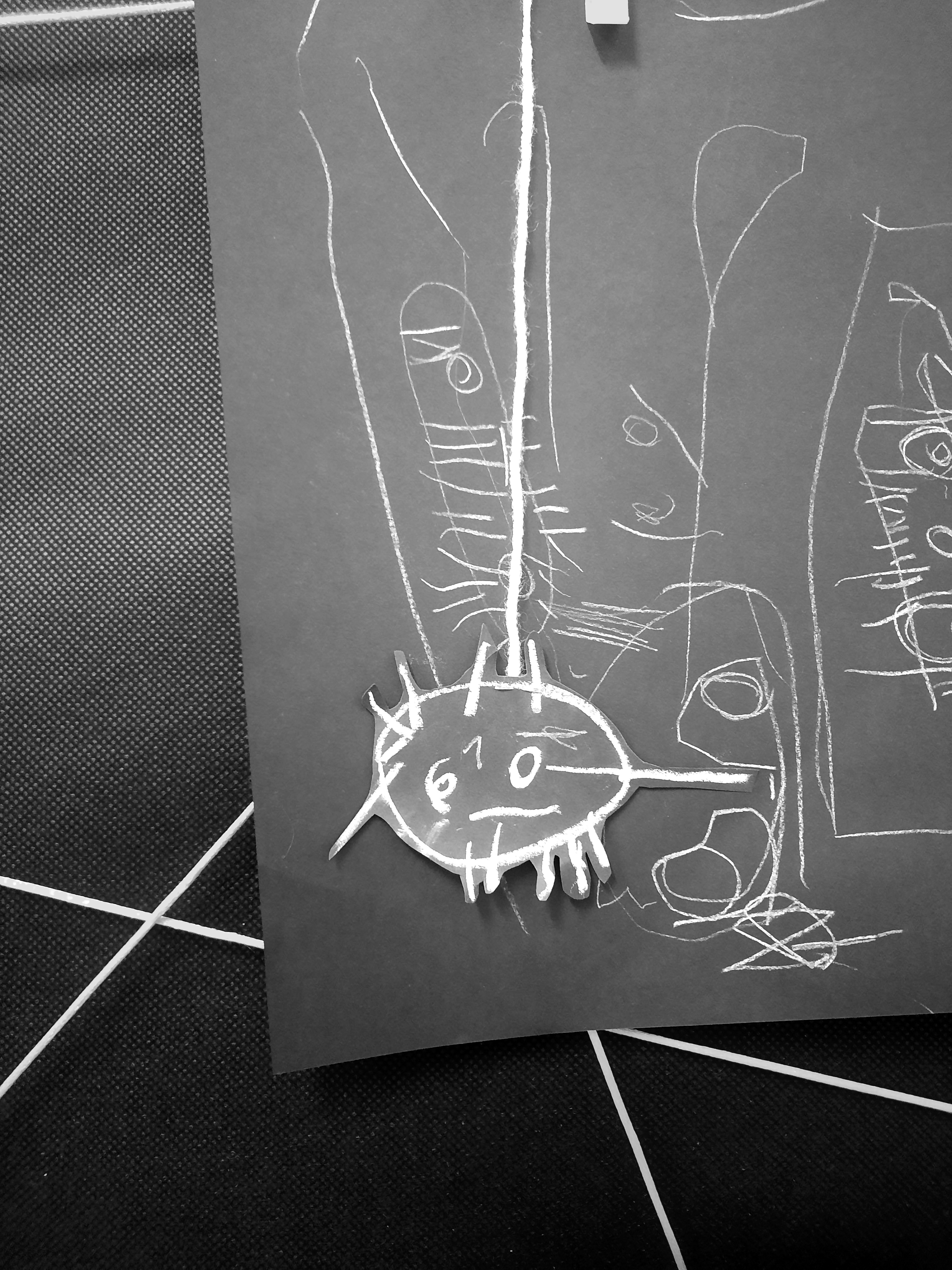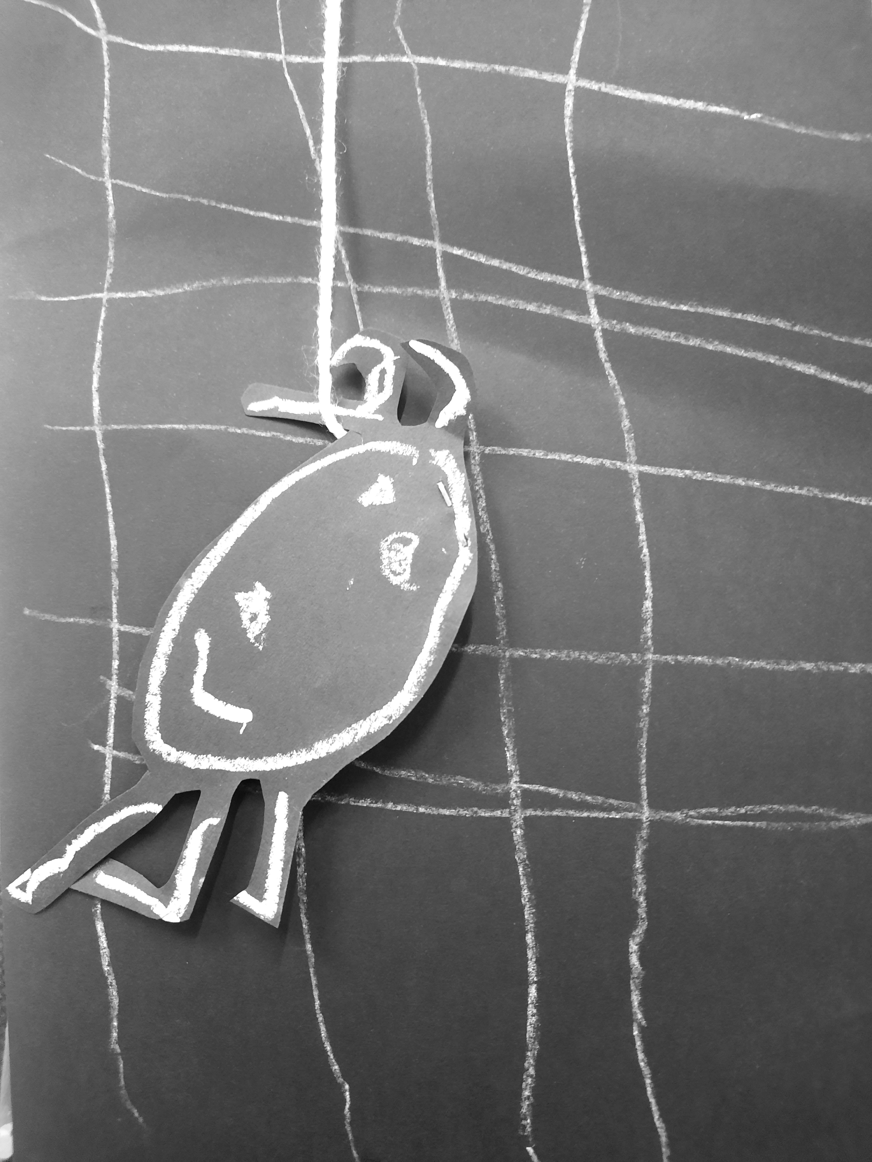 Per rappresentare le nostre piccole paure scegliamo due simboli tipici di Halloween. Da una parte riproduciamo tanti ragnetti, che disegnamo ed appendiamo con la ragnatela sullo sfondo.