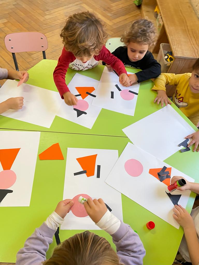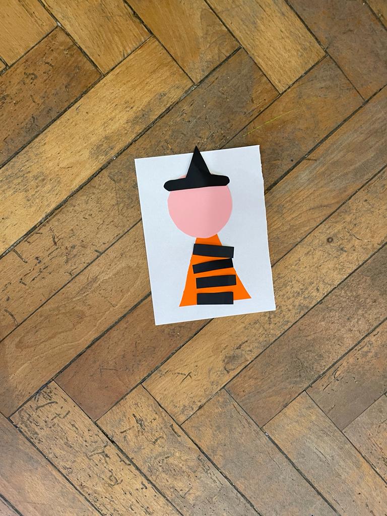 Dall’altra parte scegliamo le streghe, nel nostro caso Rossella, una strega simpatica e gentile che deve affrontare un grande drago rosso che per cena vuole papparsi “strega col pane”! Componiamo la sua sagoma sul foglio a partire da ritagli di differenti forme.