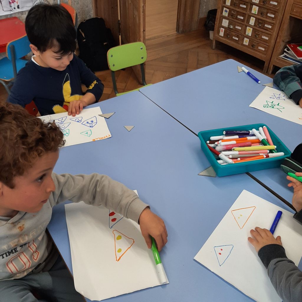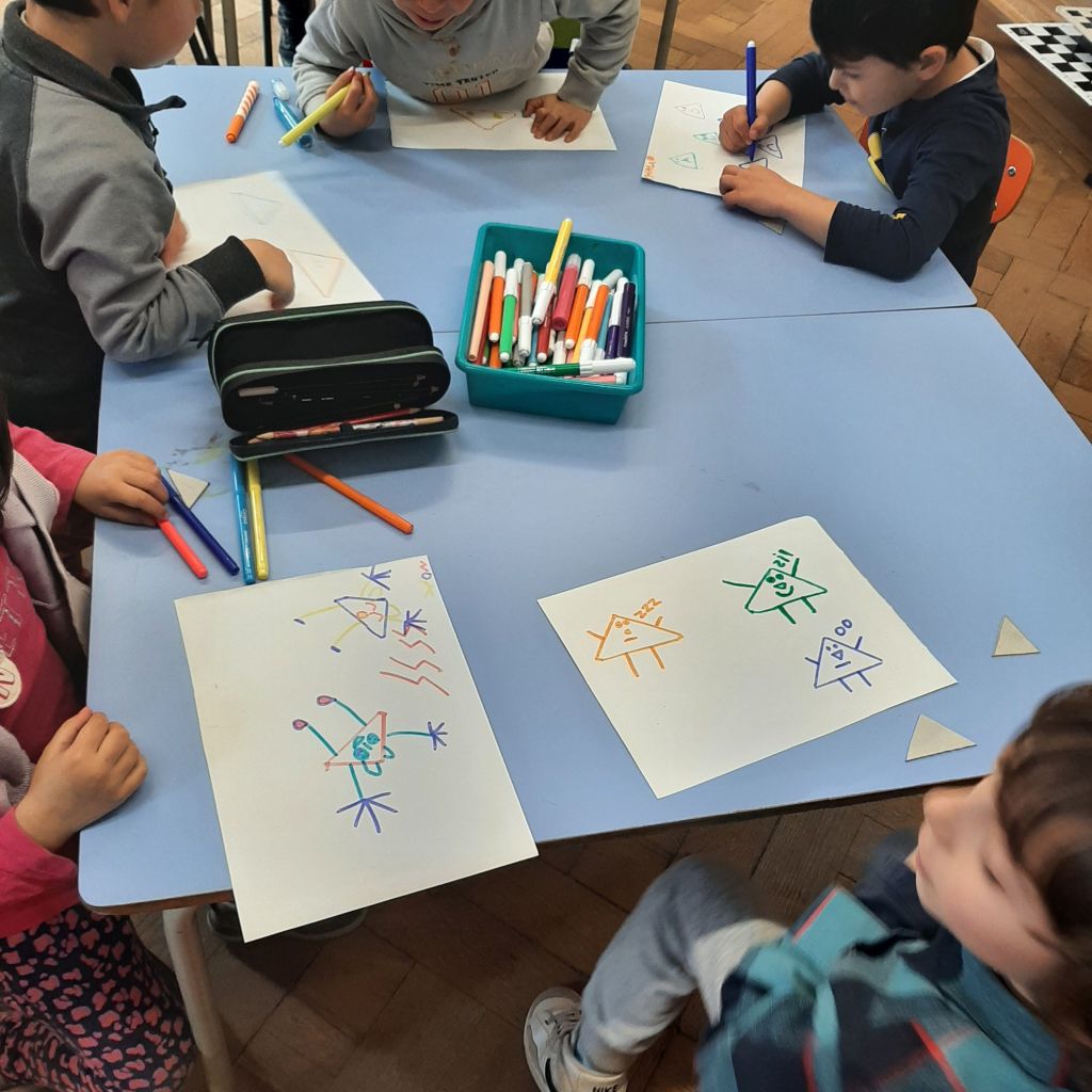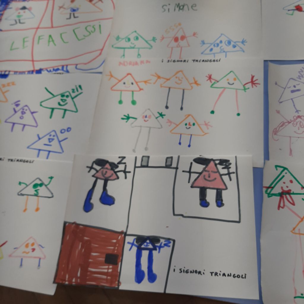 Sempre seguendo un approccio ludico, abbiamo continuato a scoprire la bellezza della logica e della matematica. Abbiamo giocato con le figure piane, ispirandoci a Piet Mondrian o a Hervé Tullet abbiamo ricreato forme geometriche buffe, come il Signor Triangolo.