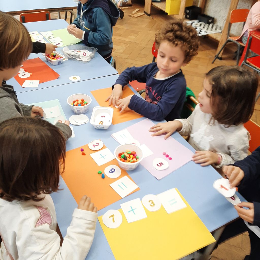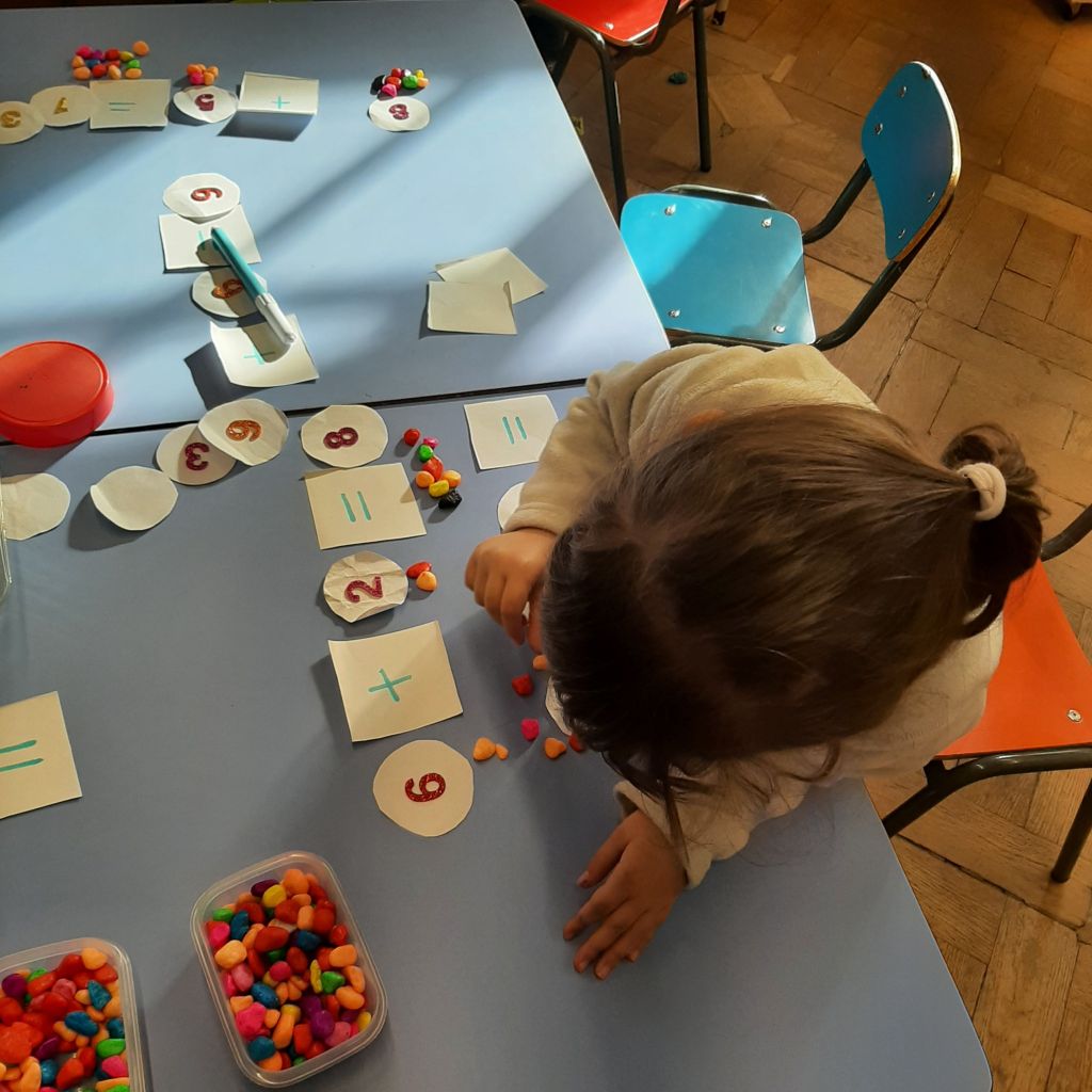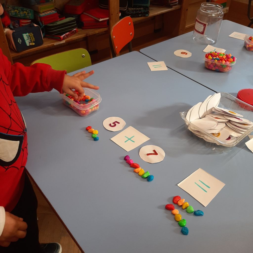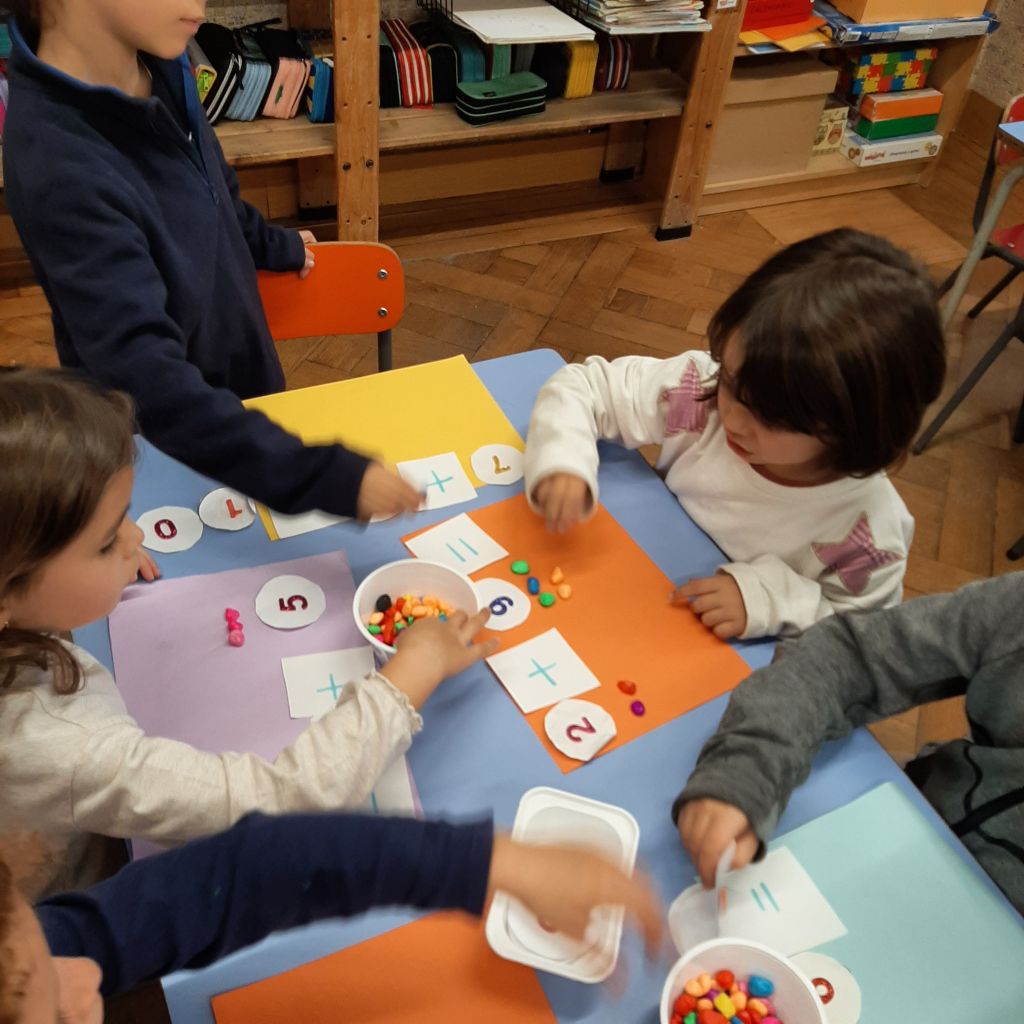 Usando linee rette o curve ci siamo accorti che ogni segno numerico ha una forma ben distinta, che lo differenzia dagli altri. Ci siamo cimentati non solo a scrivere i numeri con matite e pennarelli, ma anche a fare piccole somme con l’ausilio di vari materiali come biglie, sassolini o legumi.