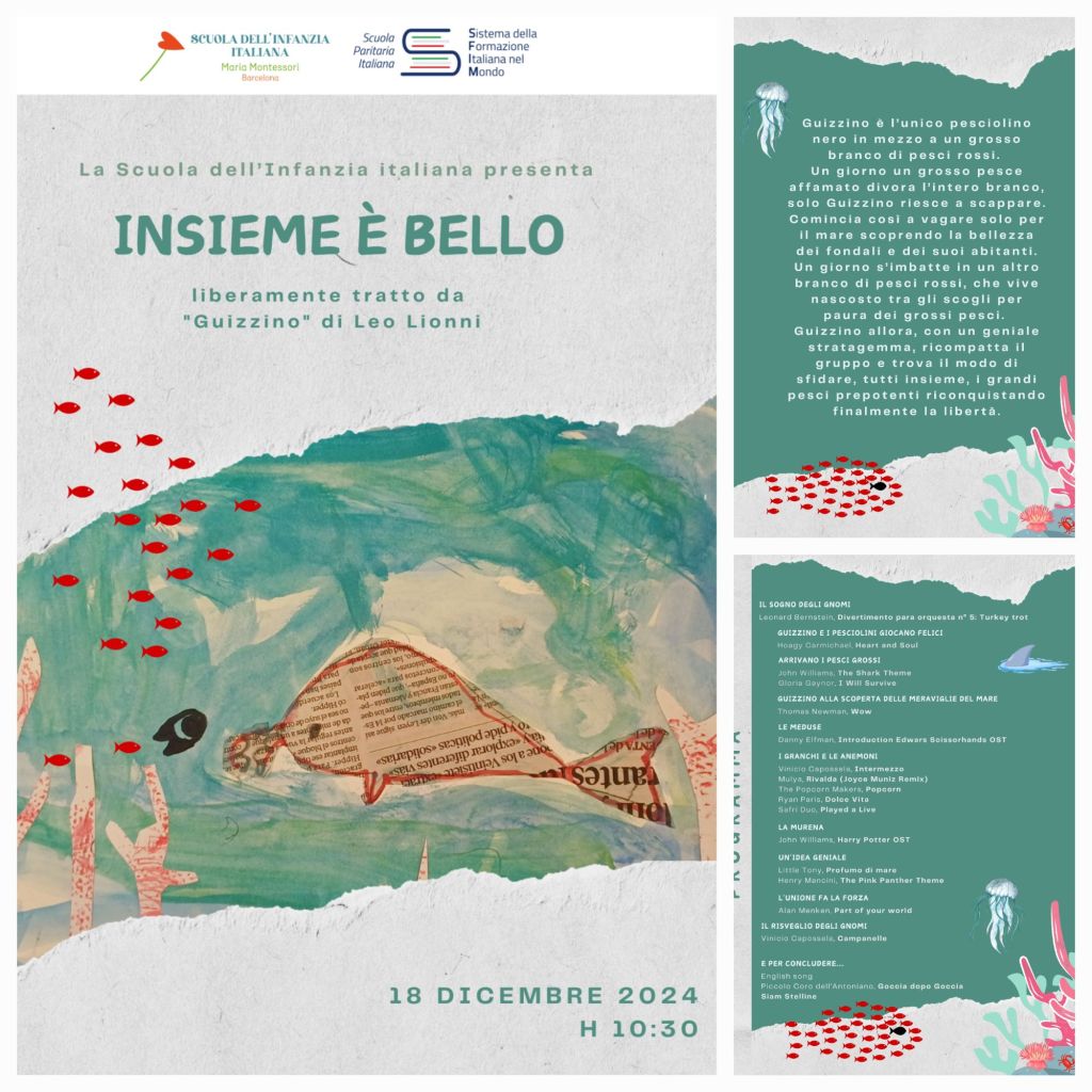 Quest’anno abbiamo rappresentato la storia di Guizzino, un pesciolino coraggioso che di fronte ad una situazione avversa decide di scrollarsi di dosso tristezza, paura, disperazione lanciandosi alla scoperta delle meraviglie della natura e del vivere insieme agli altri.