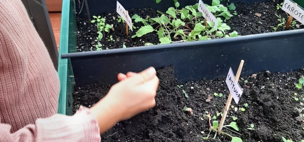 Con i bambini e le bambine del gruppo dei 5 anni ci dedichiamo a curare l’orto di scuola. Ripuliamo la terra da erbacce e da