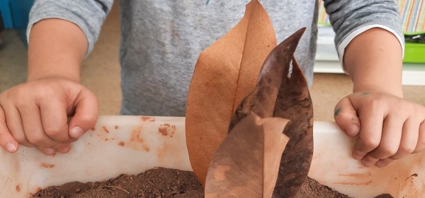 Lentamente e con calma i bambini e le bambine di 4 anni esplorano con gli occhi, le mani, il naso la terra e le foglie