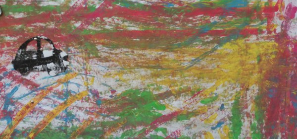 Pitturiamo ancora senza pennello. Macchinine e tempere e, a piccoli gruppi, riempiamo di strisce di colori un grande foglio bianco. Non conta il risultato ma